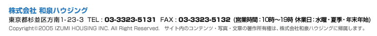 株式会社和泉ハウジング 東京都杉並区方南1-233- 電話03-3323-5131 ファックス03-33235132 営業時間10時から19時 休業日:日曜、祝祭日